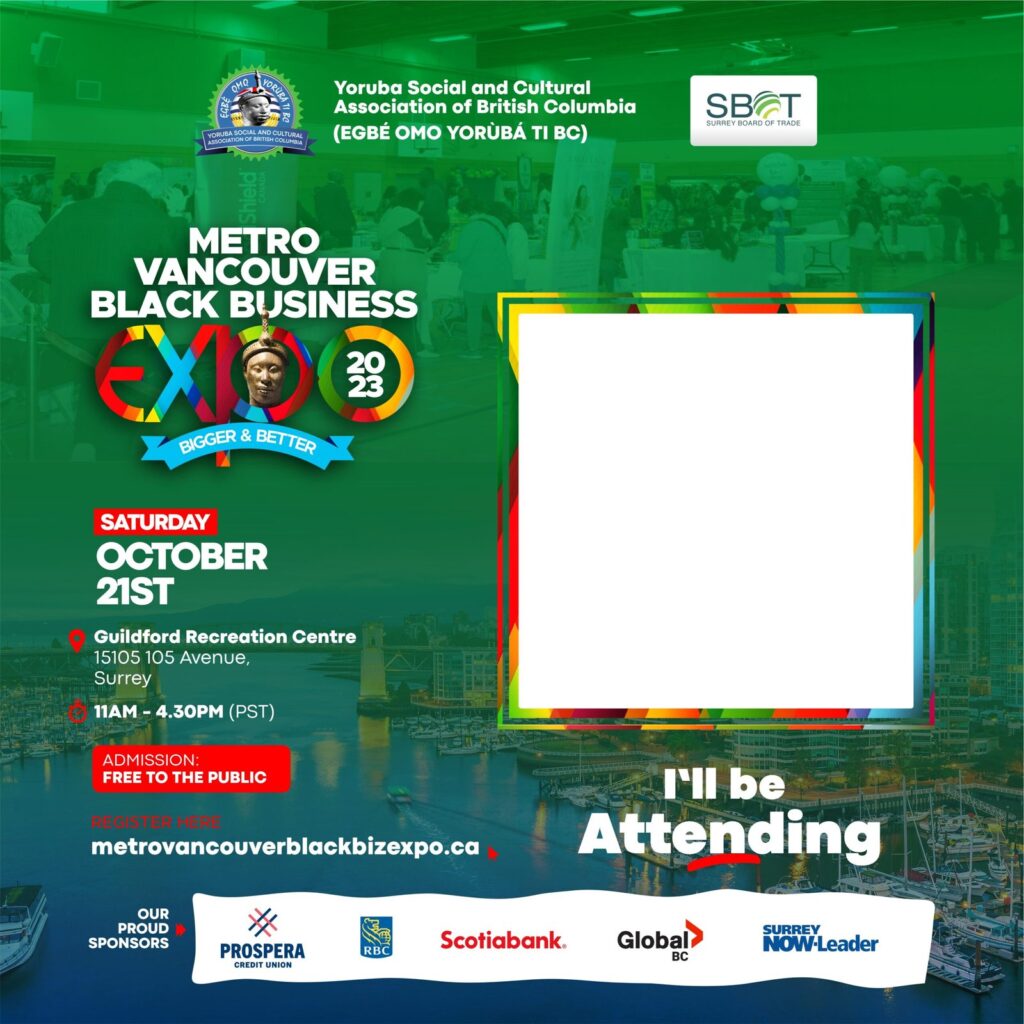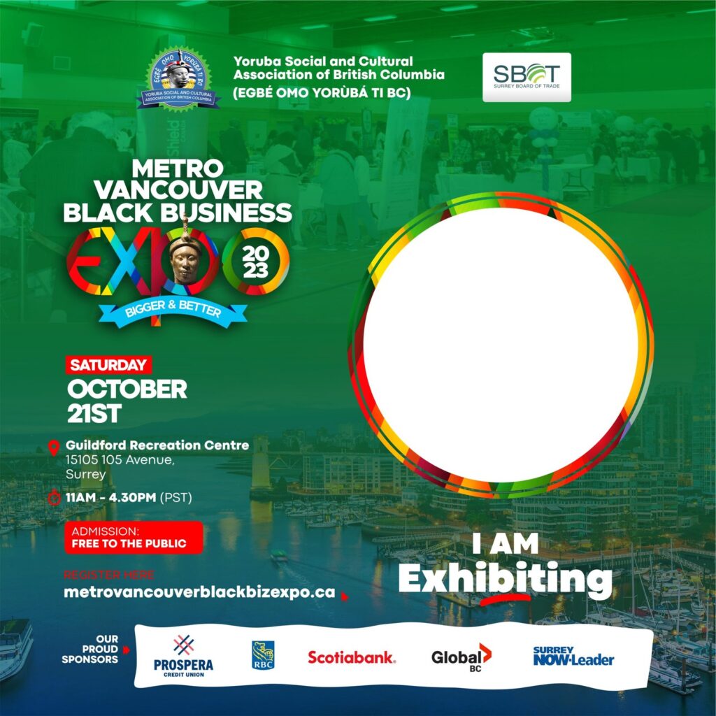 REGISTER NOW Saturday, October 21 11:00am - 4:30pm Guildford Recreation Centre - 15105 105 Avenue, Surrey. Get a Personalized Metro Vancouver Black Business Expo Flyer Sponsors B2B Networking Lounge Sponsor Supporting Sponsors Community Sponsors Media Sponsors Agenda [wpdatatable id=1] Enclosed Digital Program Exhibitors 3Hnovation Inc. A to Z Party Rentals Inc African Cultural Centre (AACCCS) Angelyn Sy Asriel-Ver BLAZE BEAUTY Boostani Dawn Decor Royal Diadem Media Company DuMonde Services Femi Adewuyi studios Gemstone Technologies Inc. Go2Girl Services Inc Kaspartyaffairs MIE MIE Mimi's Crochet Creations Mutima Nestto Consulting Inc Oja Land Prospera Credit Union Rational Immigration Consultancy Services Ltd. RBC Rekemash Casual Dumonde Beauty Royale Family Organizers Sabilink Consulting Ltd Saladmaster Scotiabank Service Canada Sihle Skincare Surrey Board of Trade Talented Hands The Altitude Foods Tossingneedle Traela Canada Limited World Financial Group Yadira Stubbs Designs Yoruba Social and Cultural Association of BC Abbeycity Hair and Beads Ankaranimi Classics Bootheac CocoTerra Naturals DKM HOUSE OILS JES Tresses Salon JOBIS Club Canada Juan Photography Lavicks Nancy and Naturals Co Inc Procurement Canada Small Circle Xrystal I WANT TO EXHIBIT 2022 Metro Vancouver Business Expo PICTURES VIDEOS REGISTER NOW
